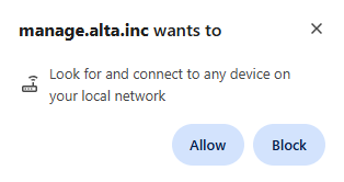 We don’t use any calls that would require local network access currently, and we don’t get this warning in our Chrome 142 testing. Are you running any plugins, and can you reproduce this every time you use manage.alta.inc? Is it in a specific section of the site?