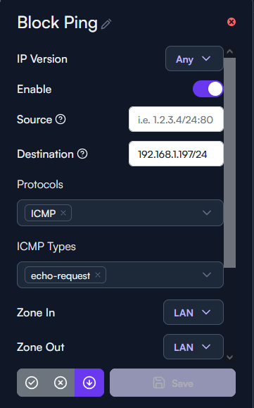 Here is how I have this FW rule configured, not matter if I change the zones or change to rule ‘deny’ or ‘drop’ I’m still able to ping this device on my network.