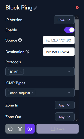 I’ve disabled the default allow ping rule and this Block Ping rule is order as the first rule in the list.