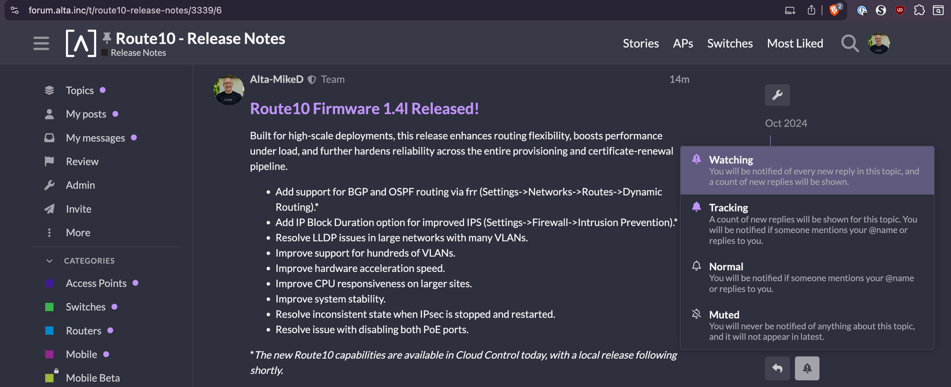You can subscribe to notifications for any of the release notes topics within the Release Notes category. Select Release Notes from the left sidebar, then choose the product you want to follow. Once you’re on that topic page, look for the notification bell on the right side. There is also a bell menu at the bottom of the page. Open the bell menu in either location and set it to Watching. Only employees can reply to these topics, so you won’t receive any unrelated or off-topic notifications.