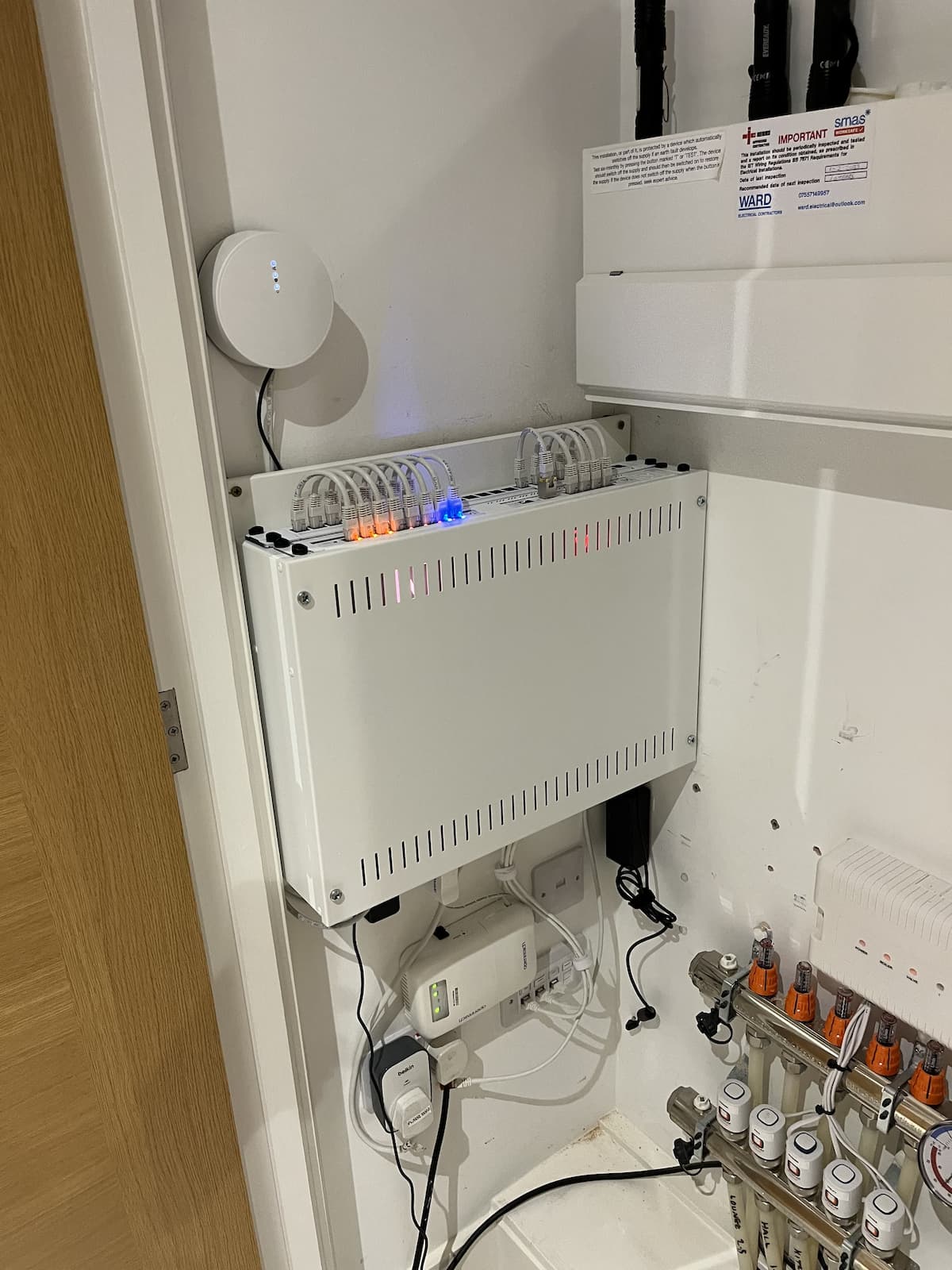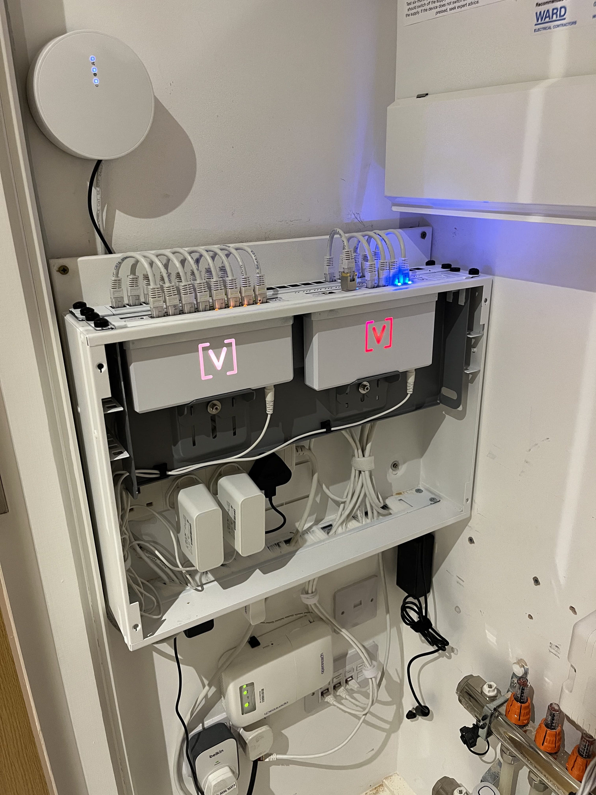 The main network is mounted inside a cupboard which houses the underfloor heating manifold, consumer unit etc, I’ve mounted 1 of the AP’s inside this cupboard but it might move to the outside of it if/when I’m allowed. The other AP is in the spare bedroom and gives full coverage of the garden and garage,