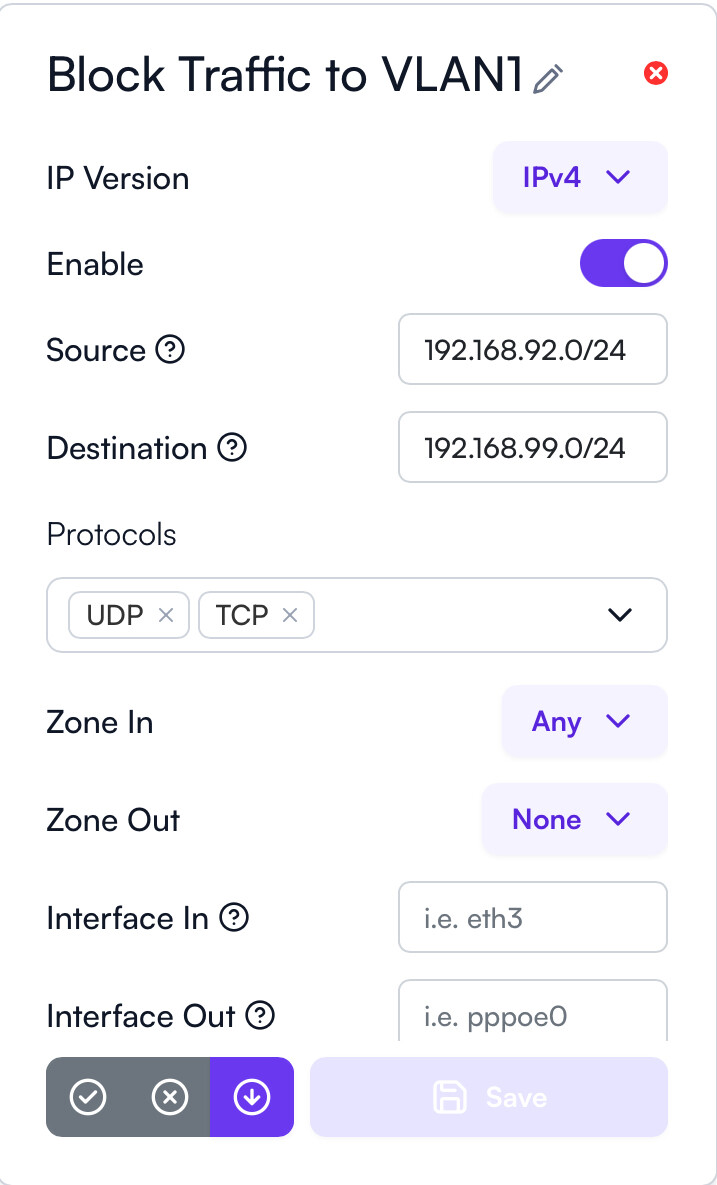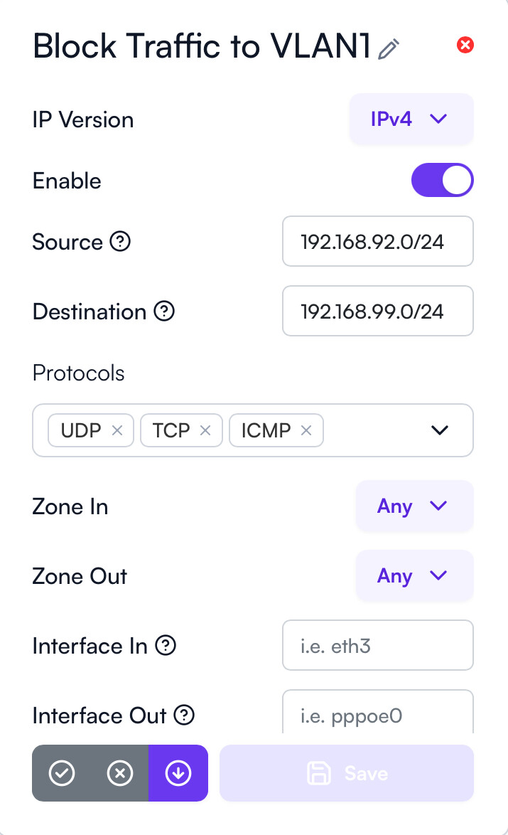 My PC connected to L2 can visit 192.168.99.1. My PC without access to 192.168.99.1 is my goal. Therefore, I created below firewall rule to achieve the goal but it failed. I want to know why it failed…