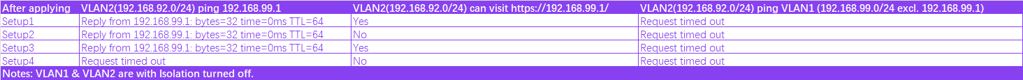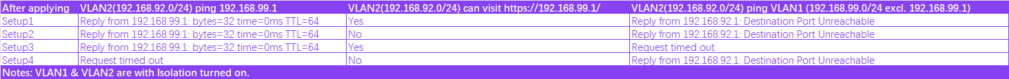 I’m confused about “VLAN2(192.168.92.0/24) ping VLAN1 (192.168.99.0/24 excl. 192.168.99.1)”: Setup1, Setup3 & Setup4 (VLAN1 & VLAN2 are with Isolation turned on) bring reply from 192.168.92.1. Why is the result not the same as Setup1, Setup3 & Setup4 (VLAN1 & VLAN2 are with Isolation turned off) to be “Request timed out” ?