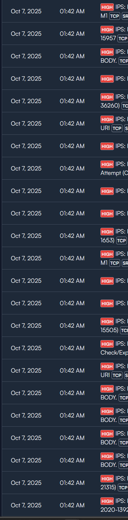 Overwhelming the queue with multiple IDS detections resulting in the following log message: 1_Route10 daemon.alert ips: too many events
