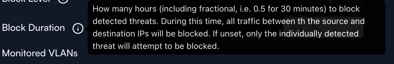 Yes, if the block duration is set, the IP addresses related to the threat will automatically be blocked for the duration. You can also unblock the IP address pair in the Events page. We can look into the “too many events” issue separately. Are you actually seeing more than 10 threats per minute in the wild? We could potentially add an option to configure the maximum, but we don’t see that many threats in actual networks.