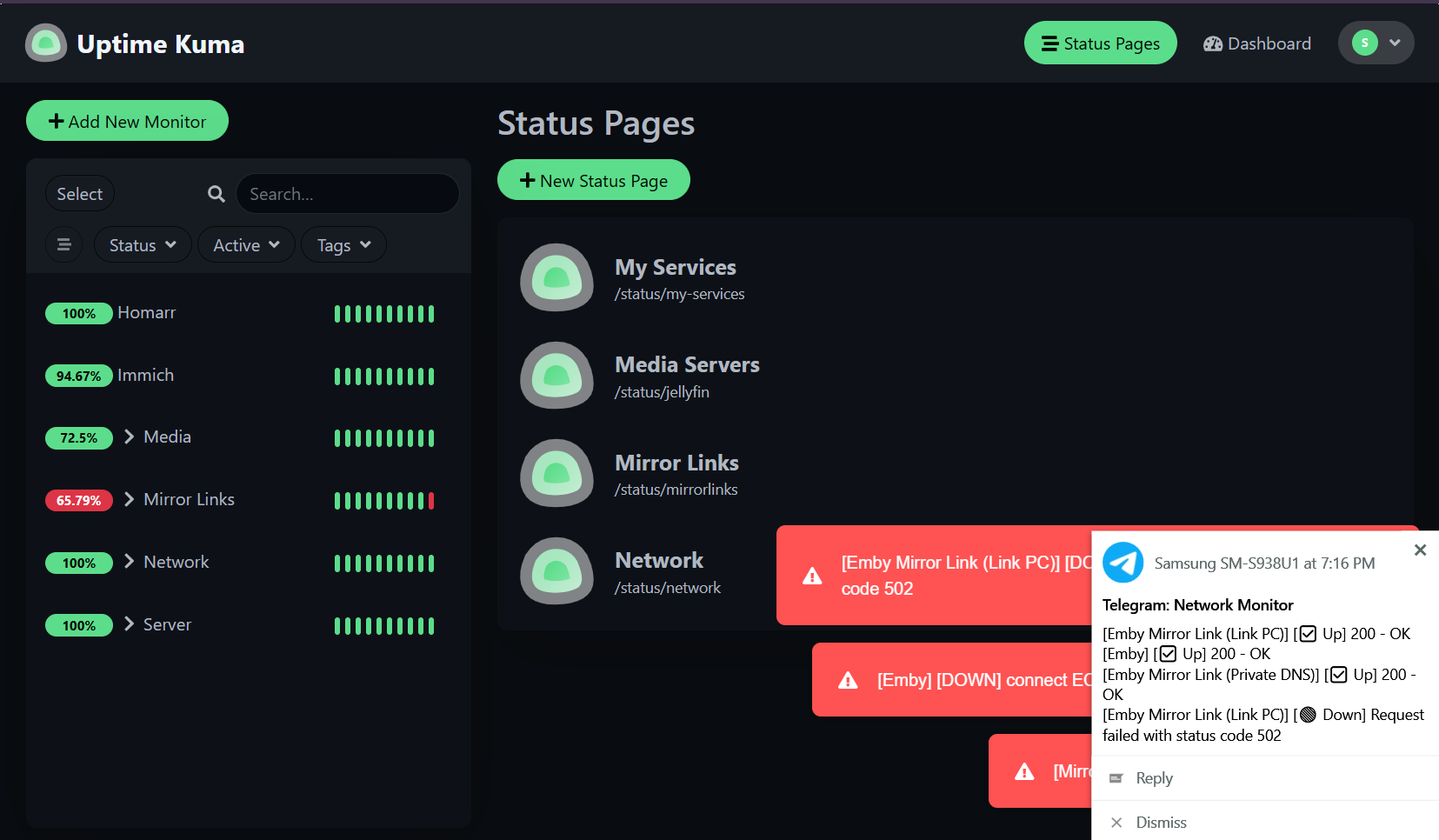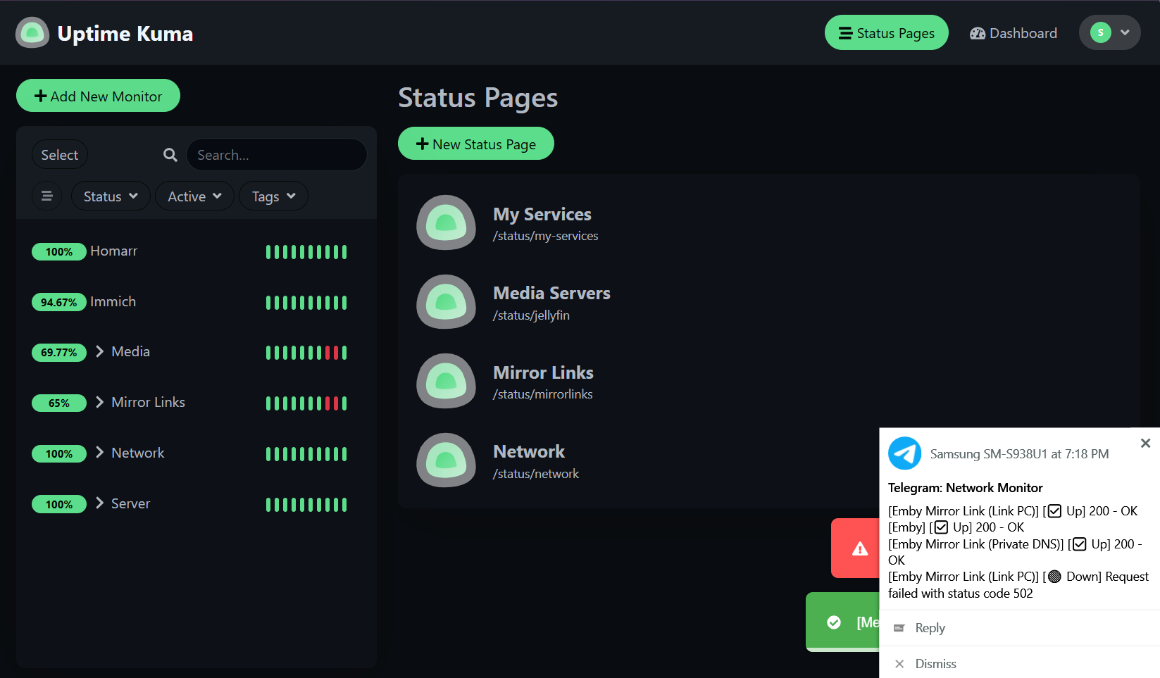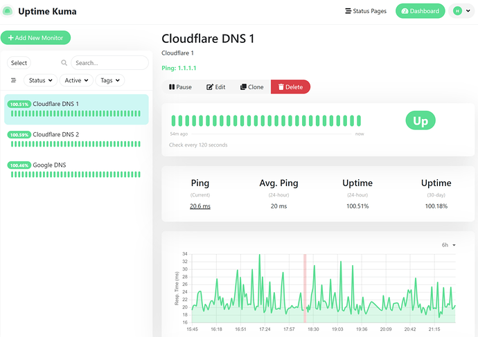 I run a program called Uptime Kuma in a docker container to monitor my various services. It dawned on me I could probably use this to monitor my connection as well. So, I set it up to ping the public ip of my main connection on 60s intervals and report the status. Uptime has several options for setting up notifications. I was using the free pushbullet option, but I reached my monthly limit so I switched the notifications to Telegram and it works perfectly.