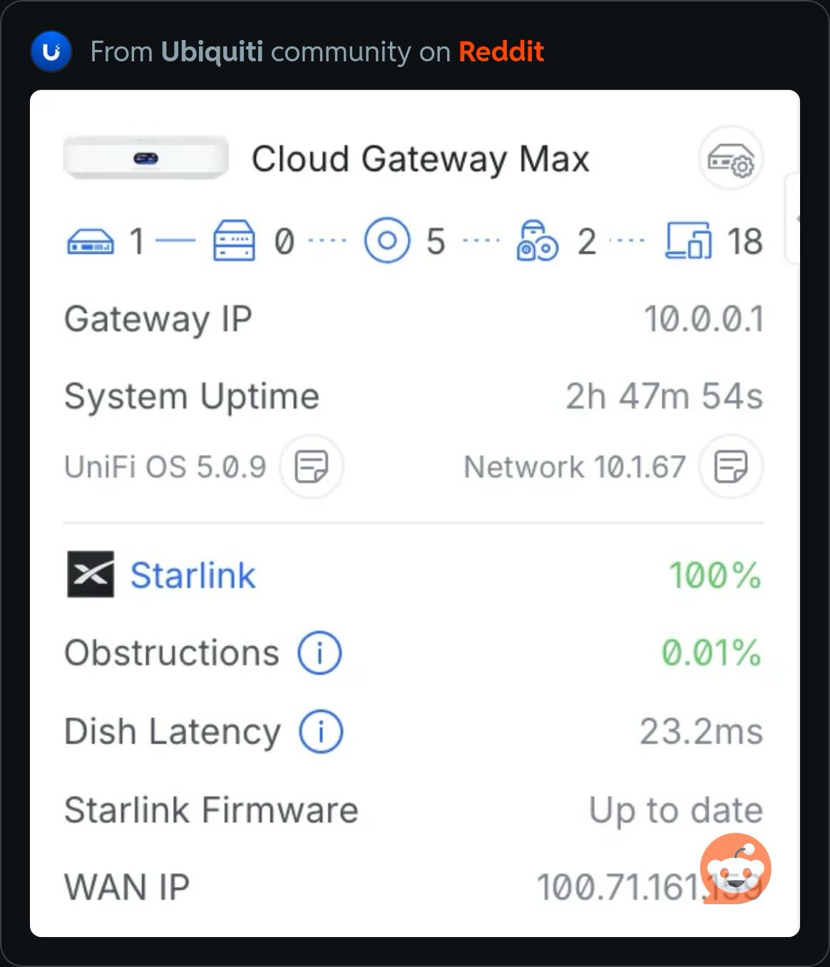 I’d like something similar to this on the dashboard - pulls through stats from Starlink via the API exposed on the local LAN.