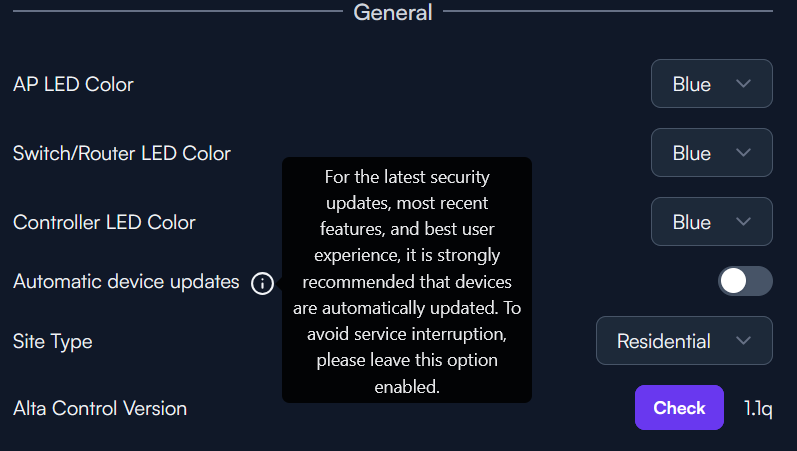 This concept works for managing and controlling upgrades per individual device with the exception of their local Alta Controller. The Control firmware will update whether you have updates on or not.