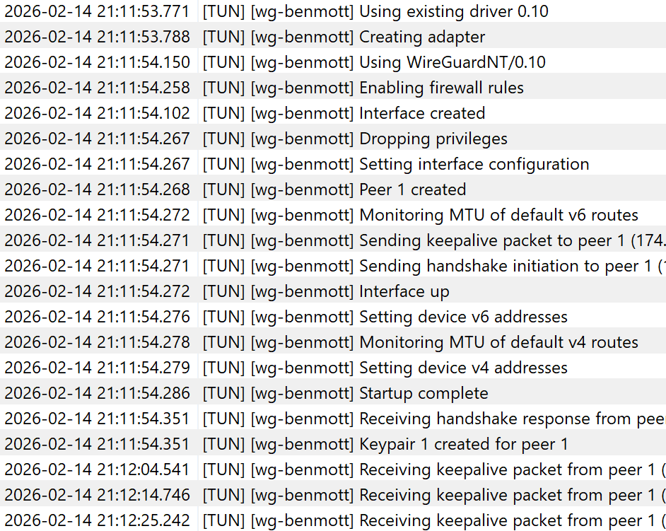 Here is what I get in my Wireguard logs on my computer from outside my network with public prefix (IP removed but it is my external IP address):