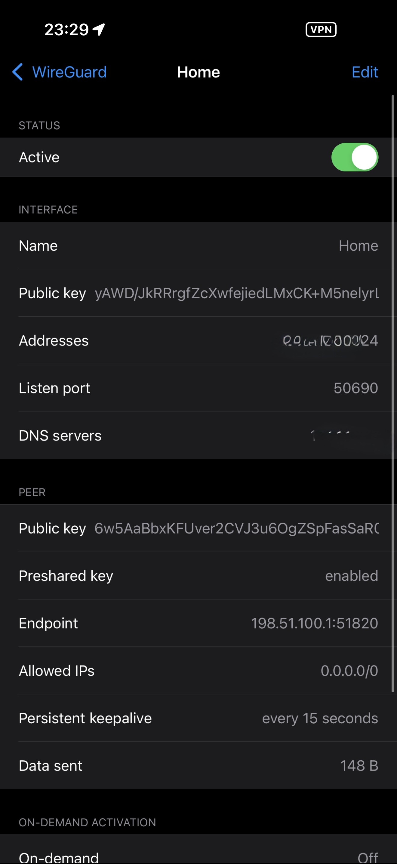 If you would like to visualize this behavior, edit the tunnel and temporarily replace the endpoint hostname under the Peer section with 192.0.2.1. This address is reserved for documentation and is not publicly routable. The tunnel will still show “Active,” but no handshake will occur and no traffic will pass.