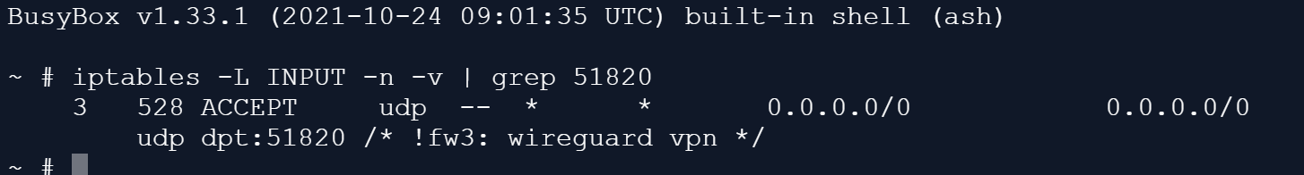 If you would like to verify this from the shell, you can check /etc/config/firewall for a rule allowing UDP on the configured listen port, or run: iptables -L INPUT -n -v | grep 51820. Replace 51820 with your configured WireGuard listen port if it differs.